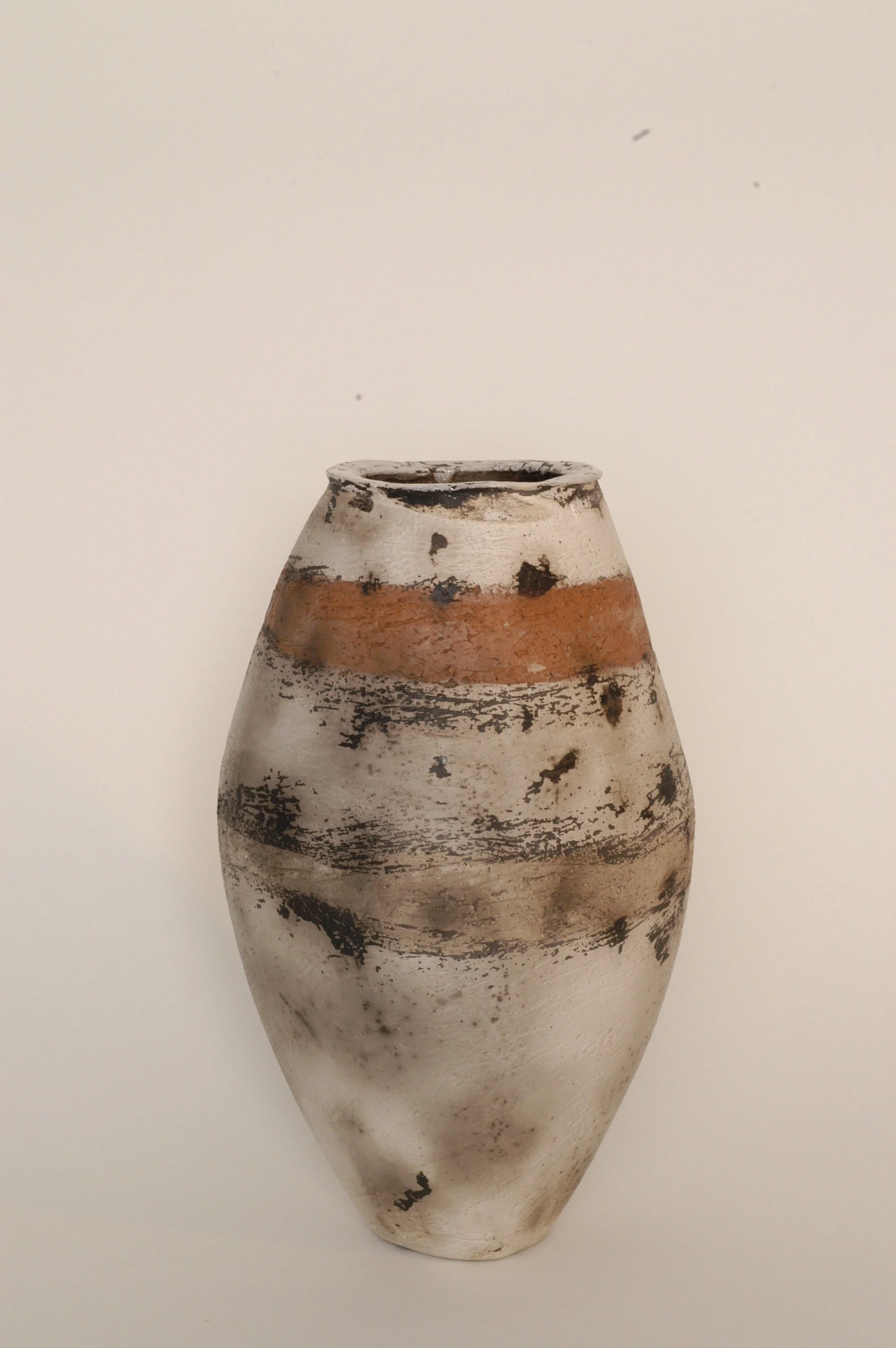 Ceramic and oak, part burnished and stained with oxides, sawdust fired.